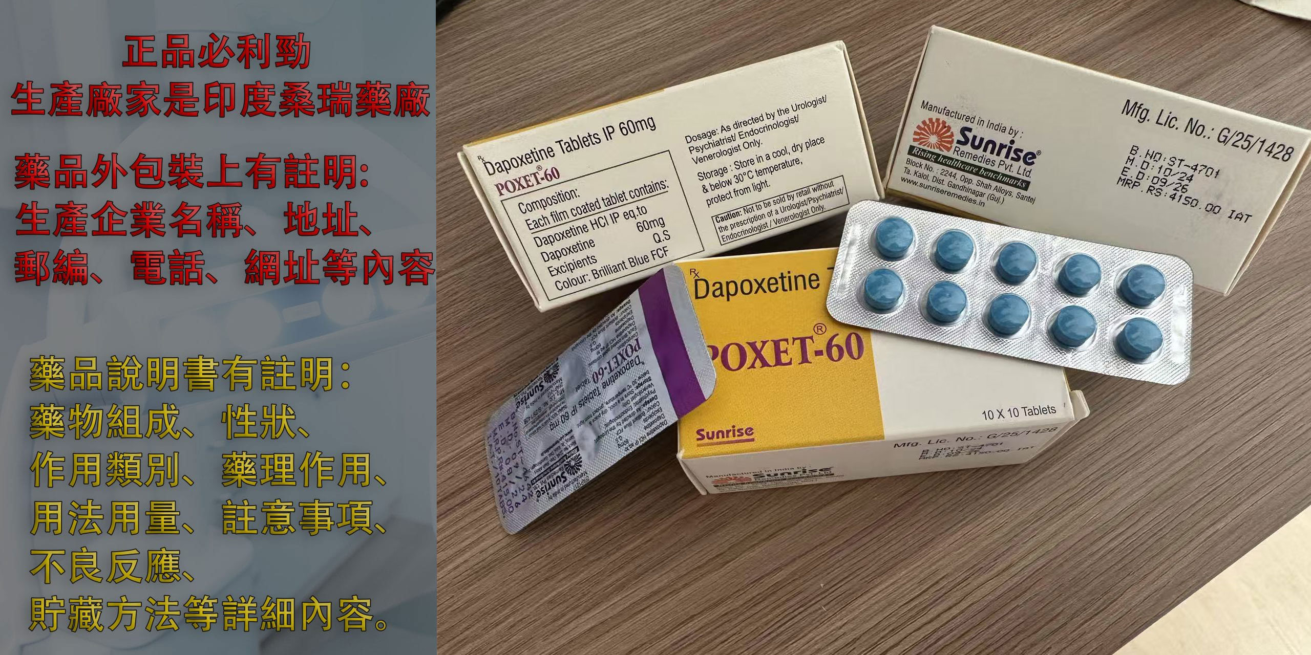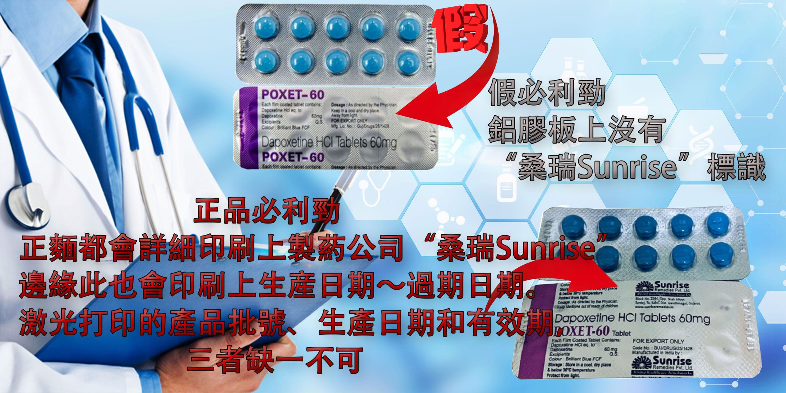 每一板正品必利勁正麵都會詳細印刷上製葯公司“桑瑞Sunrise”邊緣此也會印刷上生産日期~過期日期。