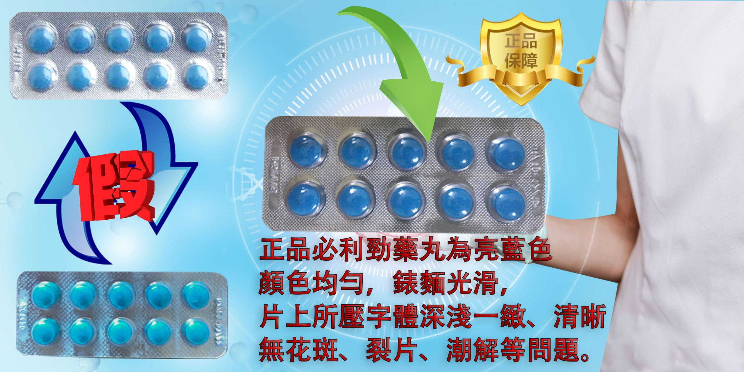 • 正品藥丸的表面光滑,有亮光,看上去清晰、光滑