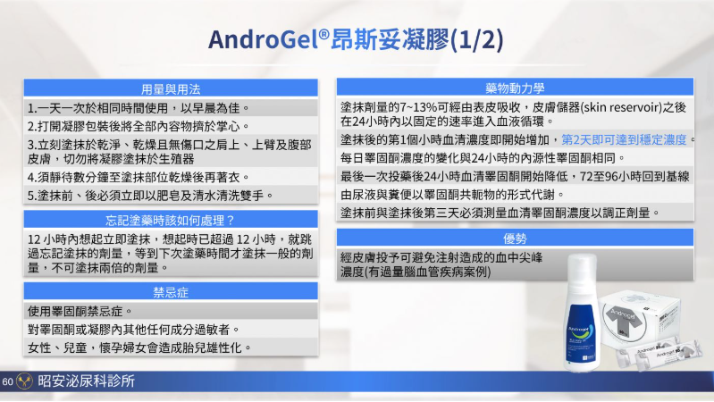 Androgel 採用外用劑型,相較於注射或口服形式,更能提供穩定血中濃度、降低肝臟負擔,且使用方式便利、順從性高。每日固定使用,有助於長期維持荷爾蒙平衡。