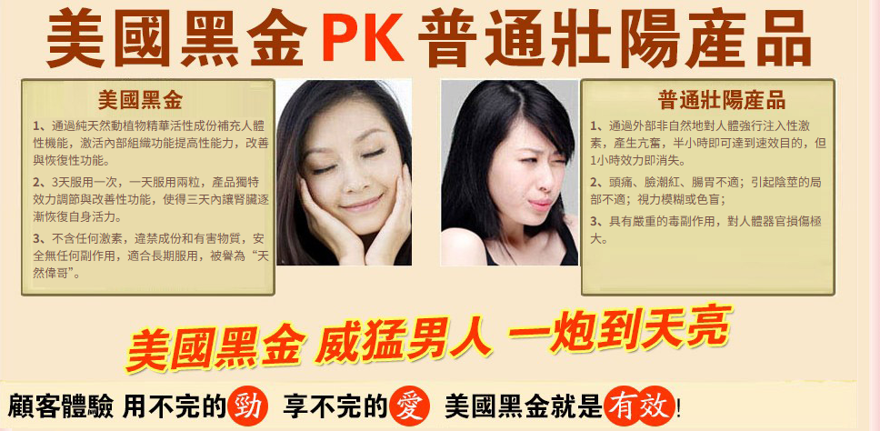 不少男生平常可能喜歡自己來,長久下來實際上場時,就容易中途疲軟,有過一次失敗的前例,讓我再接下來每一次房事過程中,總會想到上一次不愉快的經驗,久了就對心理產生壓力,自從使用了美國黑金之後,明顯感覺到自己的變得持久,那種感覺簡直是棒極了,還找回了自己的自信,可以說使用美國黑金之後發現,原來我也可以很行。