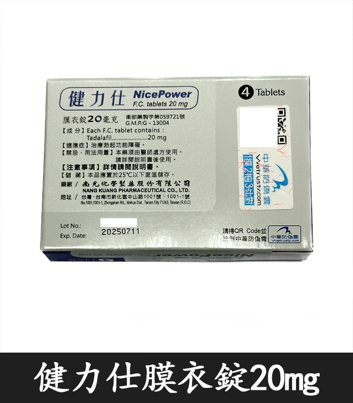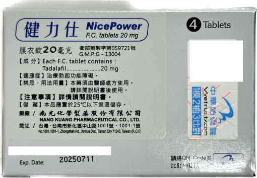 - 每盒含 4 錠 健力仕膜衣錠 NicePower 20mg,每錠含 20mg Tadalafil(犀利士成分)。