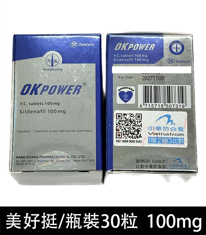美好挺 OKPOWER 100mg (瓶裝版)是一款專為成年男性設計的壯陽口服藥品,屬於 PDE5 抑制劑類藥物,其主要成分為 Sildenafil Citrate(西地那非),與原廠威而鋼相同,具備迅速改善勃起功能障礙(ED)與提升陰莖硬度的功效。瓶裝版本設計便於保存與長期使用,深受需要穩定性能力輔助的男性青睞。